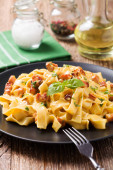 Makaron Tagliatelle z tuńczykiem, w sosie pomidorowym. Podawany na niebieskim talerzu, białe deski w tle. Widok z przodu.