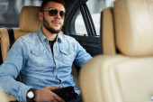 wspaniały mężczyzna w stylowe ubrania czytanie wiadomości ze smartfona