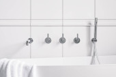 Zbliżenie na elegancki biały umywalka łazienka ze stylowym czarnym kranem i marmurowe płytki na ścianie
