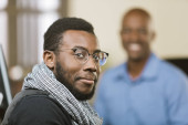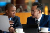 Zdjęcie "Portret afrykańskiego amerykańskiego przedsiębiorcy lub maklera pracującego na giełdzie przy użyciu komputera na tle swojego zespołu biznesowego. Koncepcja handlowa przedsiębiorcy inwestycyjnego." może być wykorzystywane do celów osobistych i komercyjnych zgodnie z warunkami zakupionej licencji Royalty-free. Obraz jest dostępny do pobrania w jakości wysokiej rozdzielczości do 5760x3840.