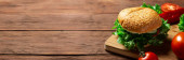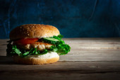 Wegetariański świeży burger na ciemnym drewnianym tle. Dieta, bez mięsa.