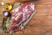 Zdjęcie "Na drewnianym stole leży surowy nóżka baraniny na kości przekłute nożem kuchennym. Owcze mięso z przyprawami, z bliska. Świeży kawałek baraniny. Widok poziomy.Styl rustykalny.. Makro." może być wykorzystywane do celów osobistych i komercyjnych zgodnie z warunkami zakupionej licencji Royalty-free. Obraz jest dostępny do pobrania w jakości wysokiej rozdzielczości do 5760x3840.