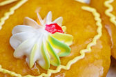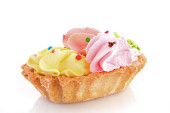 Kilka ciast z rzędu. Bita śmietana leży w spirali na koszyku na ciasto. Szczyt kremu jest posypany dekoracjami dekoracyjnymi ciasta.