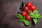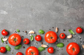 Składniki kuchni włoskiej. Pomidory ogrodowe, zioła i przyprawy. Widok góry. Układy płaskie