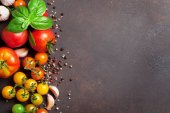 Zdjęcie "Składniki kuchni włoskiej. Pomidory ogrodowe, zioła i przyprawy. Widok góry. Układy płaskie" może być wykorzystywane do celów osobistych i komercyjnych zgodnie z warunkami zakupionej licencji Royalty-free. Obraz jest dostępny do pobrania w jakości wysokiej rozdzielczości do 5760x3840.