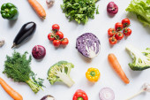Zdjęcie "widok z góry dojrzałe warzywa i nóż w pobliżu drewnianej deski do krojenia z pietruszką i cebulą na białej powierzchni, zdjęcie panoramiczne" może być wykorzystywane do celów osobistych i komercyjnych zgodnie z warunkami zakupionej licencji Royalty-free. Obraz jest dostępny do pobrania w jakości wysokiej rozdzielczości do 5760x3840.
