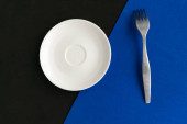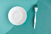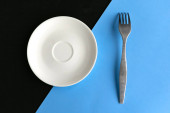 Pusty talerz i widelec na turkusowym i czarnym tle. Skopiuj miejsce na tekst. Koncepcja minimalna