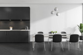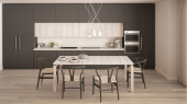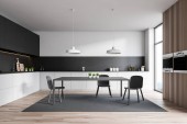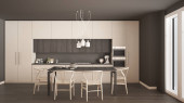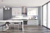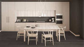 Zdjęcie "Wnętrze stylowej kuchni z szarymi ceglanymi ścianami, drewnianą podłogą, białymi szafkami i szafkami. Okrągły stół z beżowymi fotelami. 3d renderowanie" może być wykorzystywane do celów osobistych i komercyjnych zgodnie z warunkami zakupionej licencji Royalty-free. Obraz jest dostępny do pobrania w jakości wysokiej rozdzielczości do 5760x3840.