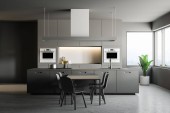 Wnętrze stylowej kuchni z szarymi ceglanymi ścianami, drewnianą podłogą, białymi szafkami i szafkami. Okrągły stół z beżowymi fotelami. 3d renderowanie