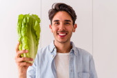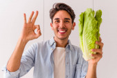 młody blondynka człowiek trzyma seler odizolowany na niebieskim tle uśmiechając się i pokazując znak zwycięstwa