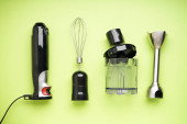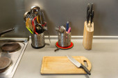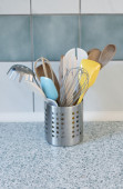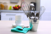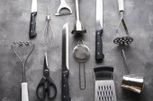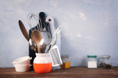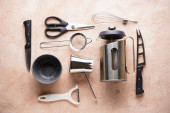 Różne przybory kuchenne na beżowym tle z miejscem na tekst.