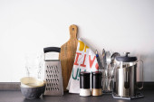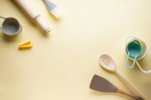 Różne naczynia kuchenne w szklance na żółtym tle z miejscem na tekst.