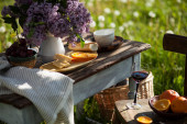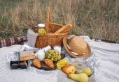 Piknik na skale, na tle dużej rzeki, jezioro. Piknik na świeżym powietrzu na polu w słoneczny dzień z bagietkami, rogalikami, brzoskwiniami, bukietem dzikich kwiatów i winogron.