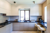 Zdjęcie "Panorama nowoczesnej kuchni czarno-białej z wyspą kuchenną, stołem jadalnym i oknem" może być wykorzystywane do celów osobistych i komercyjnych zgodnie z warunkami zakupionej licencji Royalty-free. Obraz jest dostępny do pobrania w jakości wysokiej rozdzielczości do 5760x3840.