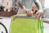 Młoda kobieta w kasku z torbą termiczną lub plecakiem jeżdżąca na rowerze po mieście, dostarczająca jedzenie. Kurier, koncepcja usługi dostawy