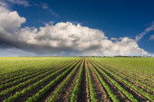 rolnictwo przemysłowe z pomidorami i nawadnianiem. Błękitne niebo z chmurami nad polem.