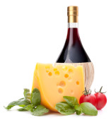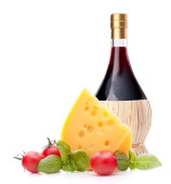 butelka czerwonego wina, ser i pomidor martwa natura