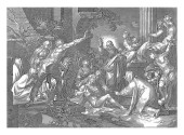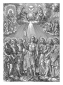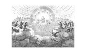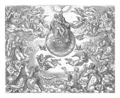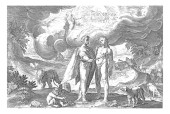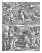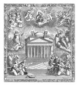 Boża odpowiedź dla Hioba, serafinów i cherubinów grających muzykę unosi się w kółko po ziemi. W środku trąby powietrznej hebrajskie litery dla Jaweh, vintage grawerowanie.