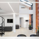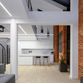 Prosty i jasny salon w stylowym mieszkaniu na poddaszu z ładnymi dużymi oknami i czerwonymi cegłami na ścianach