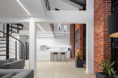 Zdjęcie "Prosty i jasny salon w stylowym mieszkaniu na poddaszu z ładnymi dużymi oknami i czerwonymi cegłami na ścianach" może być wykorzystywane do celów osobistych i komercyjnych zgodnie z warunkami zakupionej licencji Royalty-free. Obraz jest dostępny do pobrania w jakości wysokiej rozdzielczości do 5760x3840.