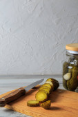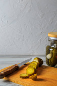 Zdrowe sfermentowane wegańskie jedzenie. Kawałki sfermentowanego ogórka i przypraw na desce do krojenia.