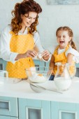 selektywne skupienie dziewczyny z matką wylewającą mleko do szklanej miski z mąką