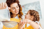 selektywne skupienie matki dodającej jajko do szklanej miski podczas gdy podekscytowana córka ugniata ciasto