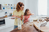 selektywne skupienie dziewczyny wskazującej palcem podczas zwijania ciasta w pobliżu matki
