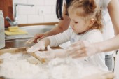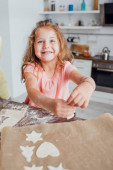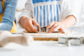 przycięty widok córki z nom walcowanie ciasta w pobliżu ciasta przecinaki, selektywne skupienie