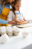 selektywne skupienie surowych wielokształtnych ciasteczek na papierze do pieczenia w pobliżu mamy i córki