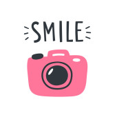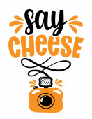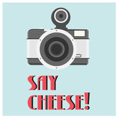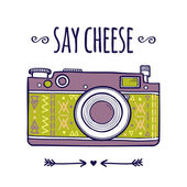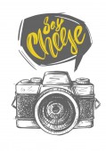 Ilustracja wektorowa z cytatem "Say cheese" i aparatem fotograficznym. Stylowe bazgroły i liternictwo. Na lable, logo i pocztówkę, plakaty, materiały drukowane, blog. Cute kawaii ilustracji projektu