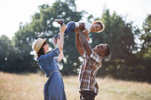 Zdjęcie "Rodzina z dziećmi spaceruje na świeżym powietrzu w lecie o zachodzie słońca. Ojciec, matka i dwójka dzieci bawią się na letnim polu. Ludzie, dzień rodzinny i koncepcja stylu życia" może być wykorzystywane do celów osobistych i komercyjnych zgodnie z warunkami zakupionej licencji Royalty-free. Obraz jest dostępny do pobrania w jakości wysokiej rozdzielczości do 5760x3840.