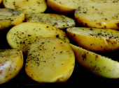 Makro zbliżenie pokrojonych ziemniaków przyprawionych ziołami i oliwą z oliwek przed włożeniem do piekarnika