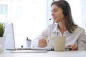 Bizneswoman w słuchawkach rozmawia z kolegami na wideokonferencji. Wieloetniczny zespół biznesowy pracujący z biura przy użyciu laptopa, omawiający raport finansowy swojej firmy