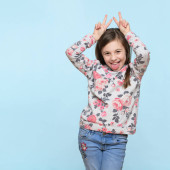 Zdjęcie "Little kaukaska dziewczyna w czerwonej sukience siedzi na kanapie, uśmiechając się z szczęśliwy twarz robi znak zwycięstwa" może być wykorzystywane do celów osobistych i komercyjnych zgodnie z warunkami zakupionej licencji Royalty-free. Obraz jest dostępny do pobrania w jakości wysokiej rozdzielczości do 5760x3840.