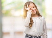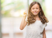 Little kaukaska dziewczyna w czerwonej sukience siedzi na kanapie, uśmiechając się z szczęśliwy twarz robi znak zwycięstwa