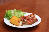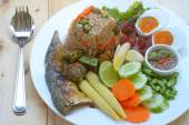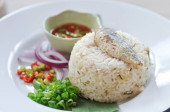 Śniadanie w białym okrągłym talerzu na drewnianej podłodze. Makrela smażona i ryż z ostrą pastą krewetkową Dip i warzyw, kapusta chińska, kukurydza niemowlęca, marchew i cebula w plasterkach.