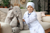 słodkie dziecko mała dziewczynka obudzić się i leży w łóżku z zabawka słoń