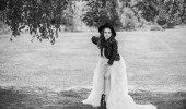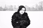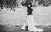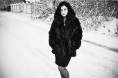 Święta Bożego Narodzenia lub Nowy Rok, magiczna atmosfera i ładna kobieta w długiej sukience w śnieżny dzień. Inspiracja i pomysł na zimę