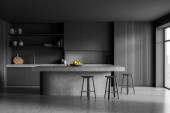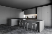 Zdjęcie "Wnętrze stylowej kuchni z szarymi i ceglanymi ścianami, betonowa podłoga, szare szafki i bar ze stołkami. 3d renderowanie" może być wykorzystywane do celów osobistych i komercyjnych zgodnie z warunkami zakupionej licencji Royalty-free. Obraz jest dostępny do pobrania w jakości wysokiej rozdzielczości do 5760x3840.