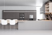 Wnętrze stylowej kuchni z szarymi i ceglanymi ścianami, betonowa podłoga, szare szafki i bar ze stołkami. 3d renderowanie