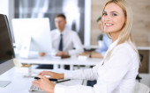 Bizneswoman i mężczyzna omawiający pytania podczas korzystania z komputera w miejscu pracy w nowoczesnym biurze. Koncepcja pracy zespołowej, spotkania i burzy mózgów