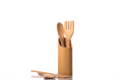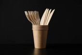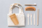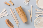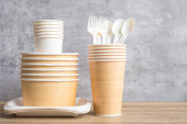 ekologiczne naturalne kubki papierowe i drewniane sztućce na szarym tle. koncepcja zrównoważonego stylu życia. zero odpadów, plastikowe przedmioty. zatrzymać zanieczyszczenie plastiku. Skopiuj przestrzeń, szablon, makietę. Wysokiej jakości zdjęcie