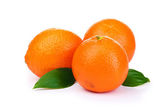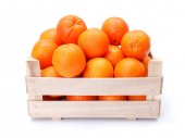 dojrzałe słodkie mandarynki w drewnianym pudełku, na białym tle