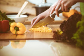 Nieznane ludzkie dłonie gotują w kuchni. Kobieta krojąca czerwone pomidory. Zdrowy posiłek i koncepcja wegetariańskiej żywności