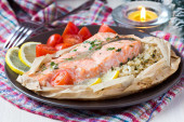 Stek czerwony łosoś na warzywa, cukinia i papryka z s