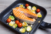 Gotowanie stek surowego łososia czerwona ryba na warzywa, cukinia, sw