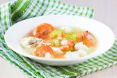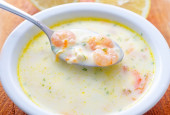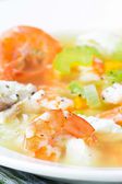 zupa rybna z krewetkami, biały filet z dorsza i okoń, seler, c