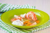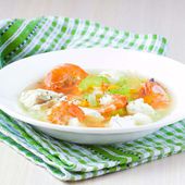 zupa rybna z krewetkami, biały filet z dorsza i okoń, seler, c