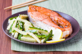 czerwona ryba z grilla, łosoś, ogórek i sos sojowy, Japonia